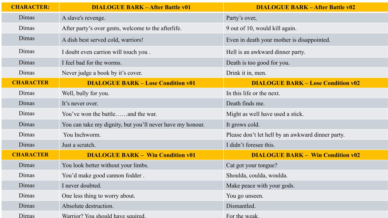 Wrote the character bio and gameplay barks using their design, combat function, and Jungian personality archetypes in mind.